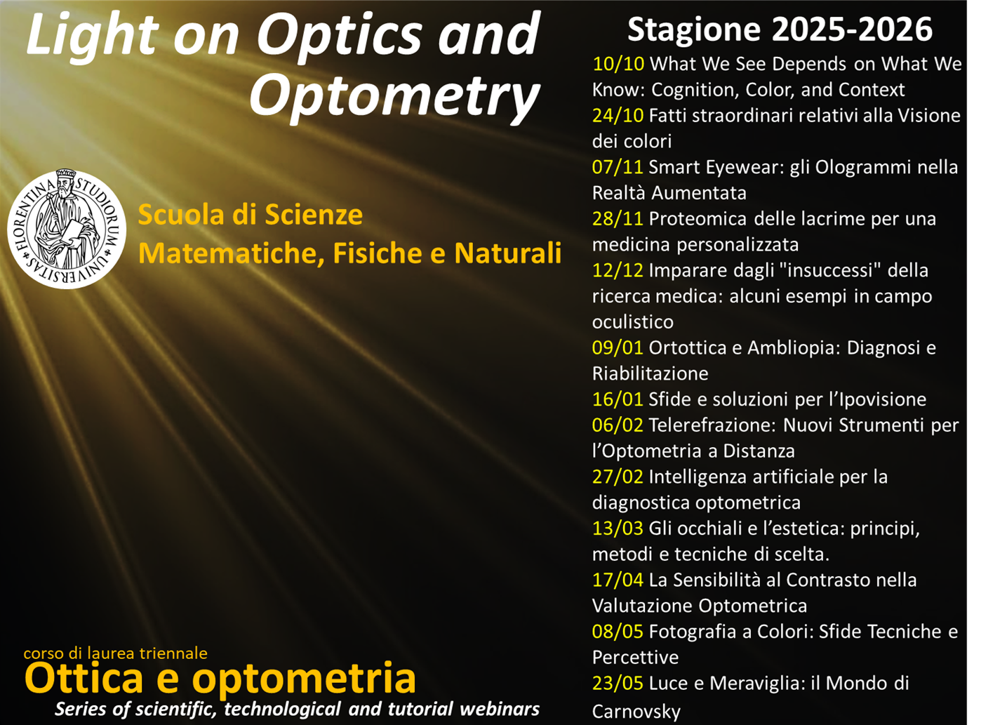 Ciclo di webinar didattici e divulgativi dedicati all’ottica e all’optometria, con l’obiettivo di approfondire i temi da prospettive diverse grazie al contributo di relatori provenienti da ambiti e competenze multidisciplinari.