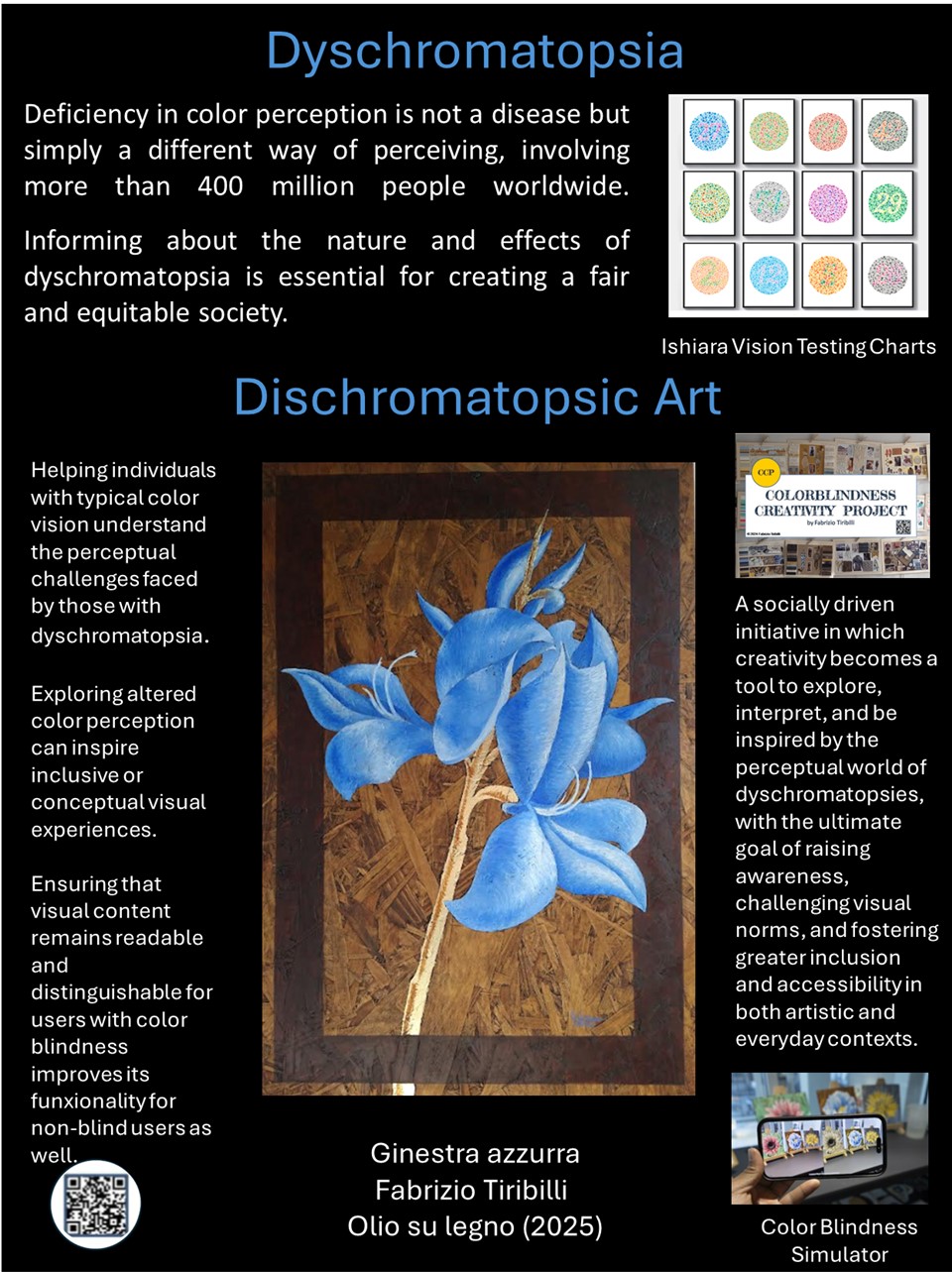 Fabrizio Tiribilli has donated his artwork Blue Broom to Enlighting Mind to support our efforts in raising awareness of color blindness among students in Optics, Optometry, and Physics, as well as among visitors to our exhibitions. In this painting, color is perceived in the same way by both deuteran or protan color-deficient viewers and those with normal vision, effectively eliminating differences between visual experiences.