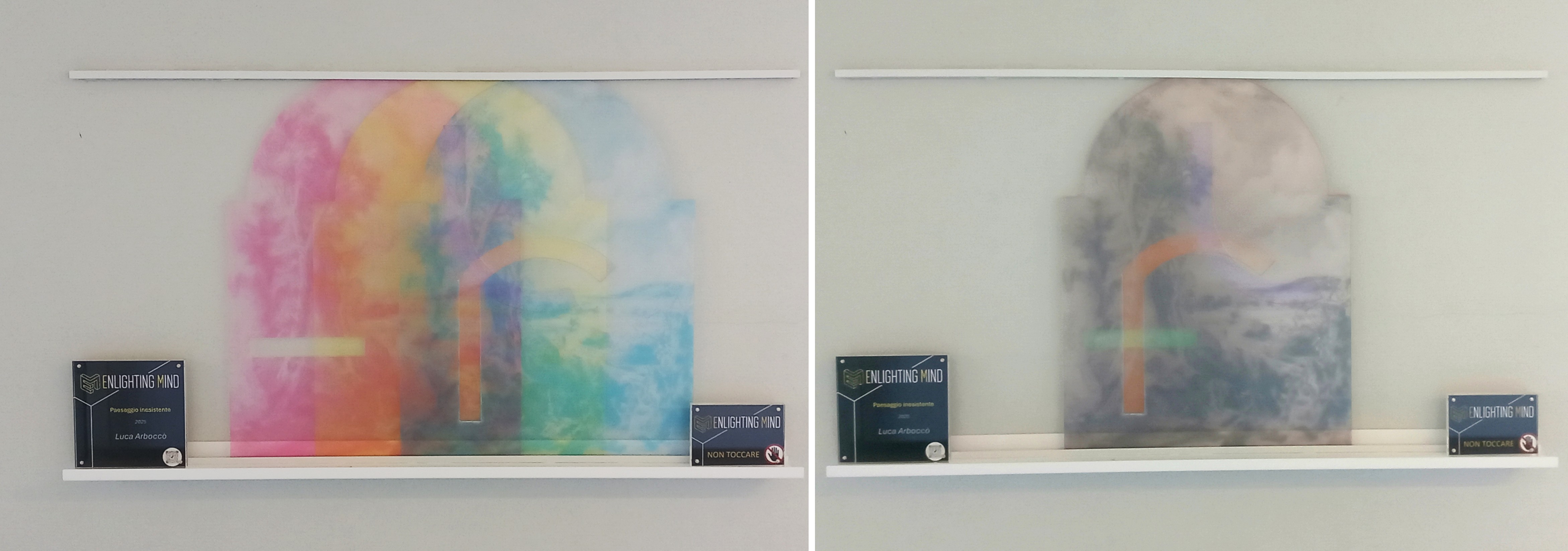 “Paesaggio inesistente” rappresenta una variazione sul tema dei “Trompe-l’oœil portatili”, serie in corso dal 2017. Queste opere nascono da dipinti realizzati in bianco e nero, le cui foto vengono scomposte a computer nei canali cromatici primari e quindi stampate su pannelli di plexiglass trasparenti. Ciano, magenta e giallo: una stampa per colore. La loro sovrapposizione esatta riporta all’immagine originale in bianco e nero, ma sfalsando i pannelli si possono creare immaginari onirici che oscillano tra pittura e stampa, trafigurazione e astrazione, tra minimalismo e barocco, tra semplice e sofisticato. Le sagomature evocano elementi architettonici, qui tentativo di ospitare il pensiero, di restituire un equilibrio, una linearità e un ordine permanenti invece lontani dal mondo naturale.